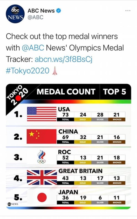 The problem is, an American friend of mine, former Olympic champion, whose name I won't be able to disclose due to confidentiality reasons, sent me an email today explaining how at least 100% of the US athletes in Tokyo are doped. Aware of this super reliable evidence, we can conclude with a very high level of certainty that the US actually won zero medals in this edition of the Olympic games.